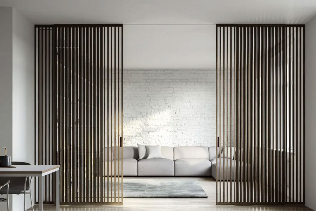 - Vách ngăn di động: Trong các container ghép đôi, sử dụng các tấm vách trượt (sliding panels) thay vì tường cố định. Những tấm vách này có thể được kéo ra để phân chia không gian ngủ/làm việc, hoặc kéo gọn lại để tạo thành một không gian mở lớn. Việc này là linh hồn của thiết kế đa năng trong nhà container.