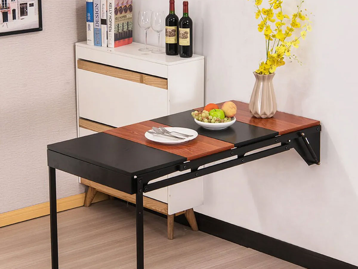 - Thiết kế bản lề: Lắp đặt một mặt bàn gỗ có bản lề gắn trực tiếp vào tường. Khi cần, chỉ việc gập mặt bàn xuống và cố định bằng chân đỡ hoặc dây cáp. Khi xong, gập mặt bàn lên và nó sẽ phẳng lỳ sát vào tường.