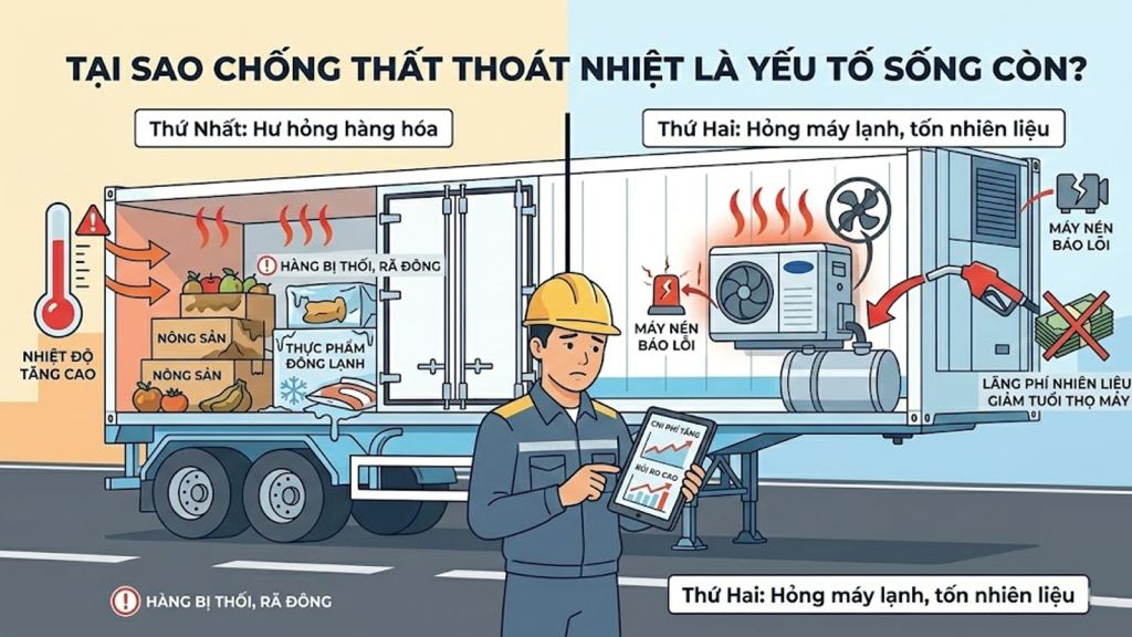 Nhiệt độ môi trường tại Việt Nam thường xuyên duy trì ở mức cao, đặc biệt là vào mùa hè khi nhiệt độ mặt đường có thể lên tới 50-60 độ C. Nếu thùng xe không được thiết kế chống thất thoát nhiệt tốt, hai hệ lụy nghiêm trọng sẽ xảy ra: