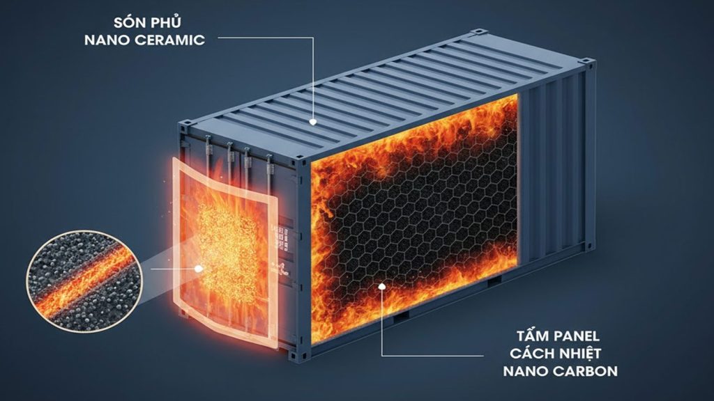 - Sơn phủ Nano Ceramic (Nano gốm): Lớp sơn này chứa các hạt gốm siêu nhỏ ở kích thước nanomet. Khi gặp nhiệt độ cao, các hạt này tự động liên kết chặt chẽ tạo thành một lớp màng chắn nhiệt vững chắc, ngăn không cho nhiệt lượng từ ngọn lửa truyền vào lớp thép của container.
