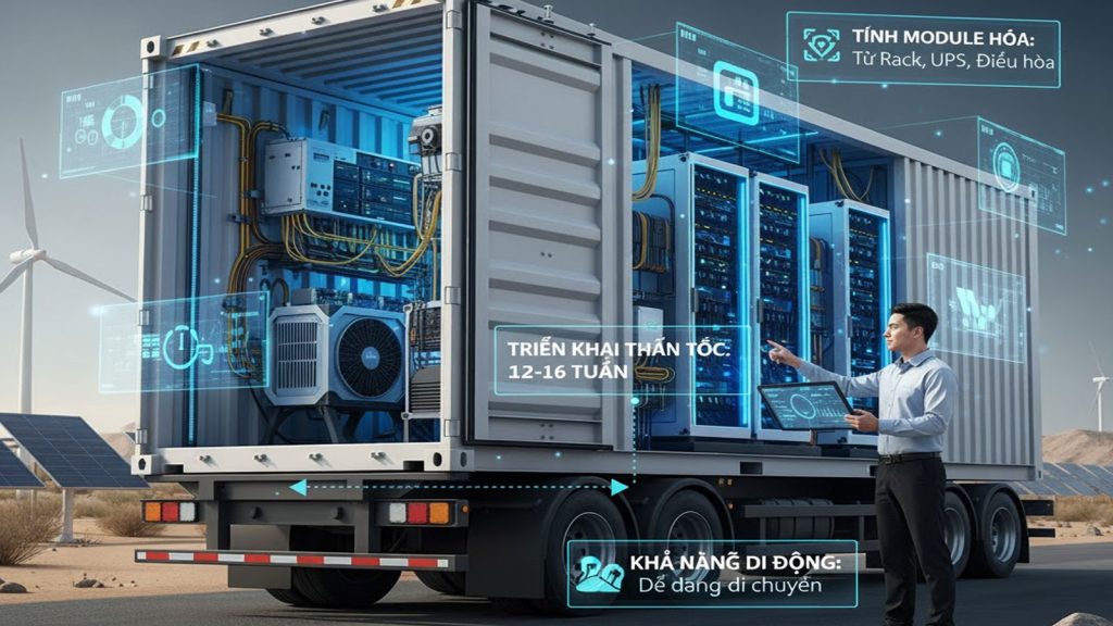 - Khả năng di động: Doanh nghiệp có thể dễ dàng di chuyển toàn bộ trung tâm dữ liệu bằng xe đầu kéo mooc đến các vị trí mới (công trường, khu công nghiệp, vùng sâu vùng xa) mà không làm gián đoạn hệ thống quá lâu.