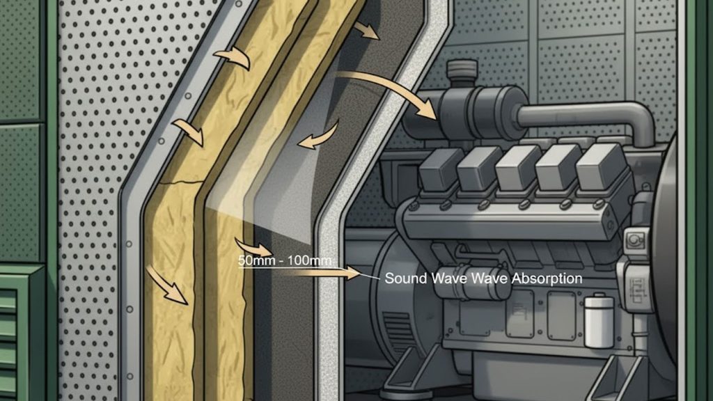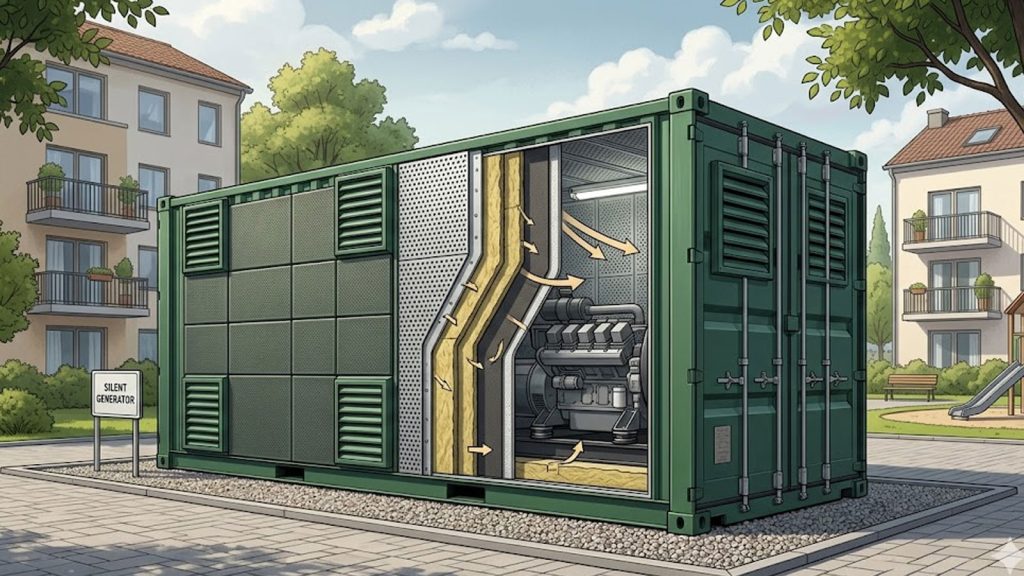 - Hộp tiêu âm đầu vào và đầu ra (Air Intake & Discharge Louvers): Thiết kế dạng chữ Z hoặc dạng mê cung (Labyrinth). Luồng gió làm mát máy phải đi qua các vách ngăn được bọc vật liệu tiêu âm, khiến sóng âm bị đập vào các vách ngăn này và suy giảm cường độ trước khi thoát ra môi trường.
