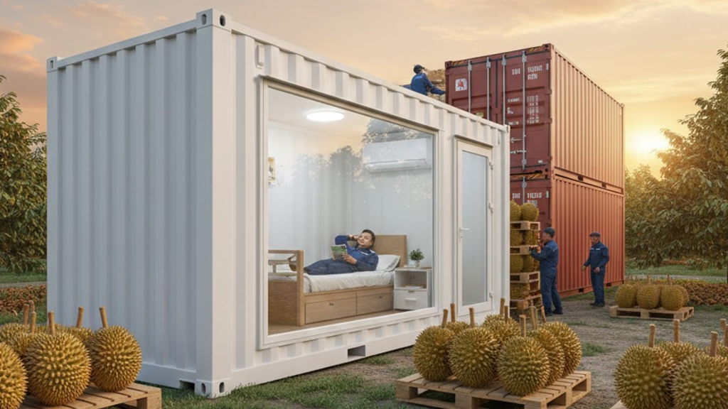 Mùa thu hoạch trái cây thường diễn ra dồn dập, nhân sự tại vựa phải làm việc cả ngày lẫn đêm để kịp đóng hàng lên moóc lạnh. Một nơi nghỉ ngơi chất lượng ngay tại hiện trường là yếu tố sống còn để duy trì năng suất lao động.