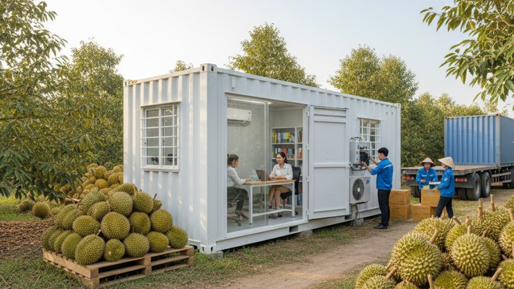 Trong bối cảnh ngành xuất khẩu trái cây Việt Nam đang bùng nổ, các vựa thu mua tại Long An, Tiền Giang hay Đắk Lắk luôn trong tình trạng hối hả. Tại đây, việc quản lý dòng hàng, sổ sách và đảm bảo sức khỏe cho đội ngũ nhân sự trực chiến 24/7 là bài toán then chốt. Thay vì xây dựng các công trình kiên cố tốn kém và thiếu linh hoạt, giải pháp sử dụng văn phòng container 20ft đã trở thành lựa chọn ưu việt, vừa làm kho mini chứa vật tư, vừa là nơi nghỉ ngơi tiện nghi ngay tại bãi.