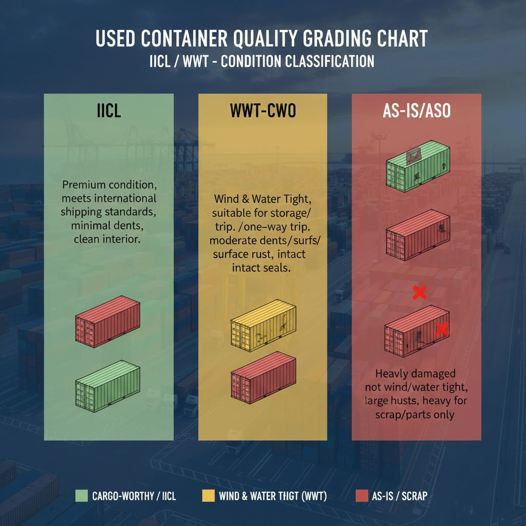 Khám phá 5 tiêu chí đánh giá container cũ chuyên nghiệp. Hướng dẫn cách mua container cũ an toàn, hiểu rõ phân loại container IICL WWT và ước tính giá trị thanh lý container cho các dự án xây dựng hoặc lưu trữ.