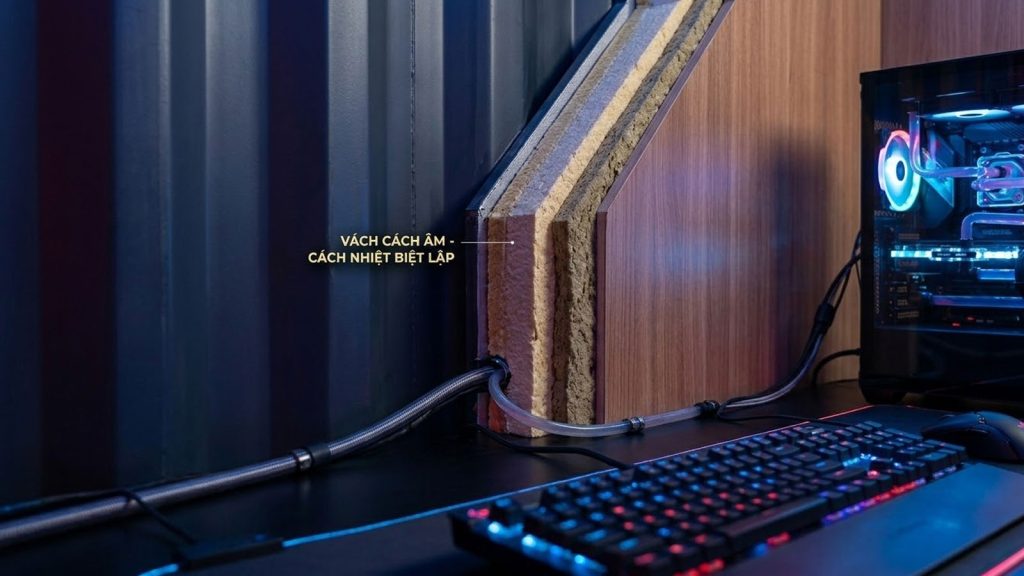 - Khả năng cách âm chuyên dụng: Vách thép container của Tân Thanh rất dễ dàng để thi công các lớp mút tiêu âm, gỗ tán âm bên trong. Điều này không chỉ chặn âm thanh ra ngoài mà còn tạo ra môi trường âm học hoàn hảo cho các hệ thống loa vòm 7.1 hay microphone thu âm của các Streamer.