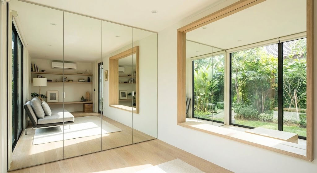 • Gương đối diện cửa sổ: Đặt gương ở vị trí phản chiếu trực tiếp cảnh quan sân vườn bên ngoài. Gương không chỉ mang thêm mảng xanh vào nhà mà còn giúp khuếch tán ánh sáng tự nhiên đến mọi ngóc ngách tối tăm.