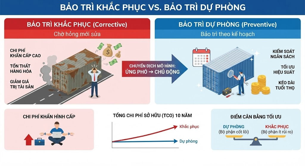 Trong quản trị tài sản container, việc lựa chọn chiến lược bảo trì đóng vai trò quyết định đến hiệu quả tài chính và an toàn vận hành. Hai phương thức phổ biến nhất hiện nay là Bảo trì khắc phục (Corrective Maintenance) và Bảo trì dự phòng (Preventive Maintenance). Việc hiểu rõ sự khác biệt về bản chất chi phí giữa hai phương thức này sẽ giúp doanh nghiệp tối ưu hóa ngân sách vận hành và kéo dài tuổi thọ tài sản.