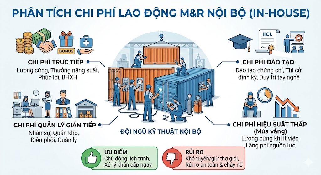 Trong quản trị container, bài toán “Tự làm hay Thuê ngoài” (Make or Buy) luôn xoay quanh việc tối ưu hóa chi phí lao động và hiệu quả vận hành. Chi phí lao động M&R không chỉ đơn thuần là tiền lương, mà còn bao gồm các chi phí ẩn về đào tạo, quản lý và hạ tầng.