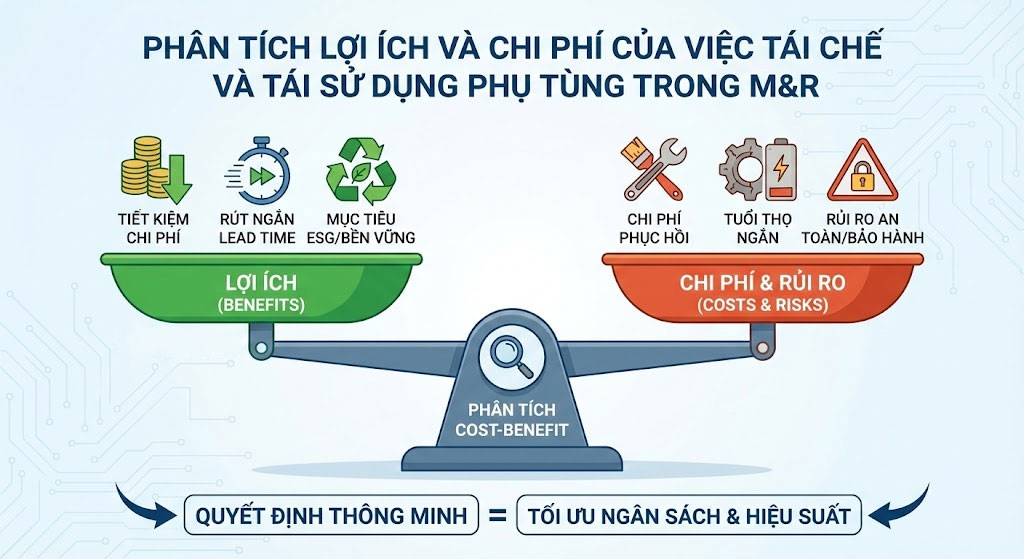 Nếu Lợi ích thuần là số dương lớn, việc tái chế là khả thi. Nếu con số này nhỏ hoặc âm, doanh nghiệp nên ưu tiên mua mới để đảm bảo tính ổn định của hệ thống.