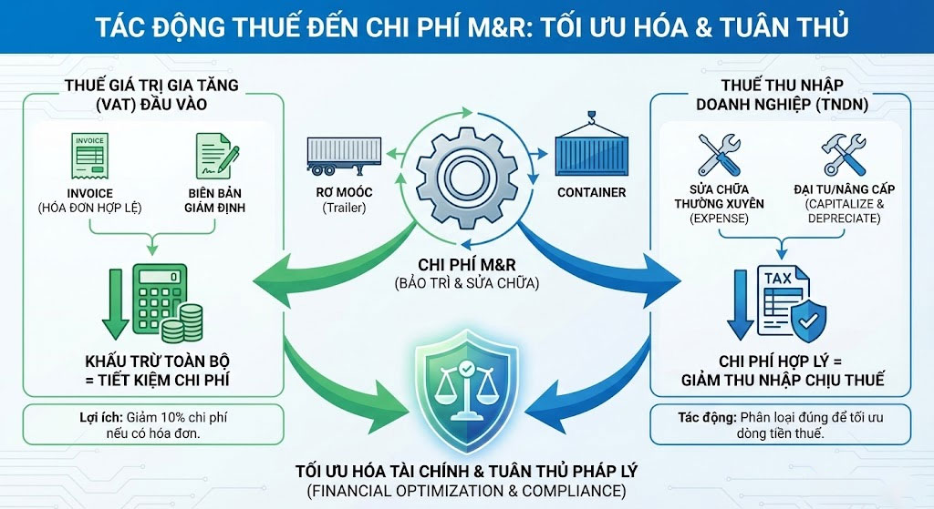 Trong quản trị tài chính logistics, chi phí Bảo trì và Sửa chữa (M&R) không chỉ là một khoản chi vận hành thuần túy mà còn là một công cụ tối ưu hóa thuế quan trọng. Việc hiểu rõ các quy định về thuế giá trị gia tăng (VAT), thuế thu nhập doanh nghiệp (TNDN) và các quy tắc khấu hao sẽ giúp doanh nghiệp giảm bớt gánh nặng tài chính, đồng thời đảm bảo tính tuân thủ pháp lý.