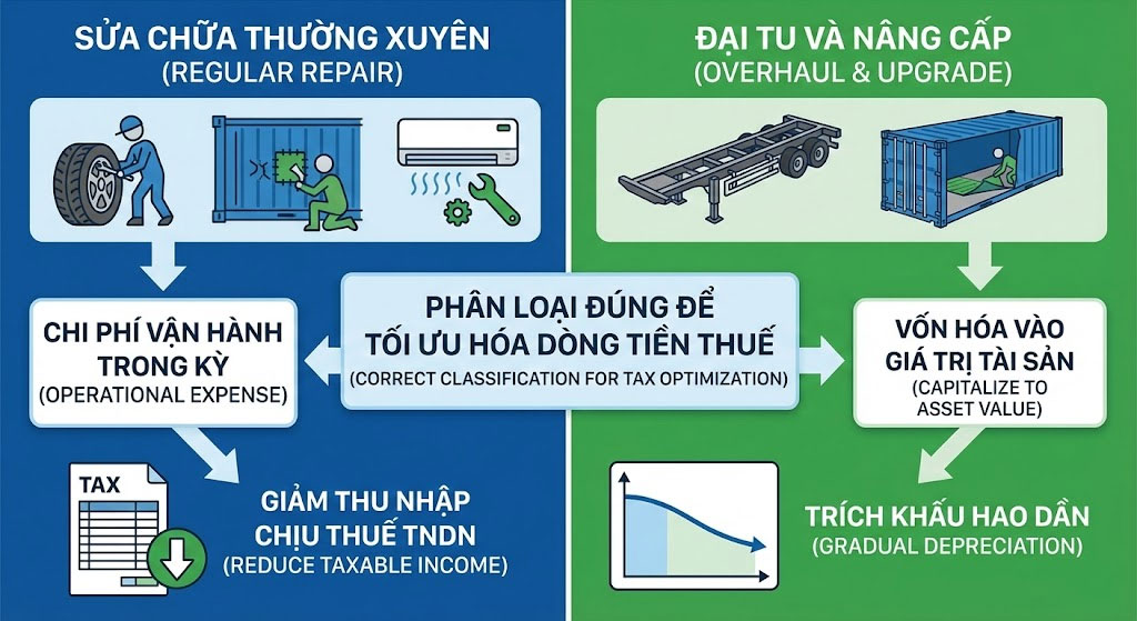 • Đại tu và nâng cấp: Nếu việc sửa chữa làm tăng giá trị tài sản hoặc kéo dài thời gian sử dụng (như thay toàn bộ khung xương moóc, thay sàn container hàng loạt), khoản chi này có thể phải được vốn hóa vào giá trị tài sản và trích khấu hao dần. Việc phân loại đúng giữa “Sửa chữa” và “Nâng cấp” là mấu chốt để tối ưu hóa dòng tiền thuế.