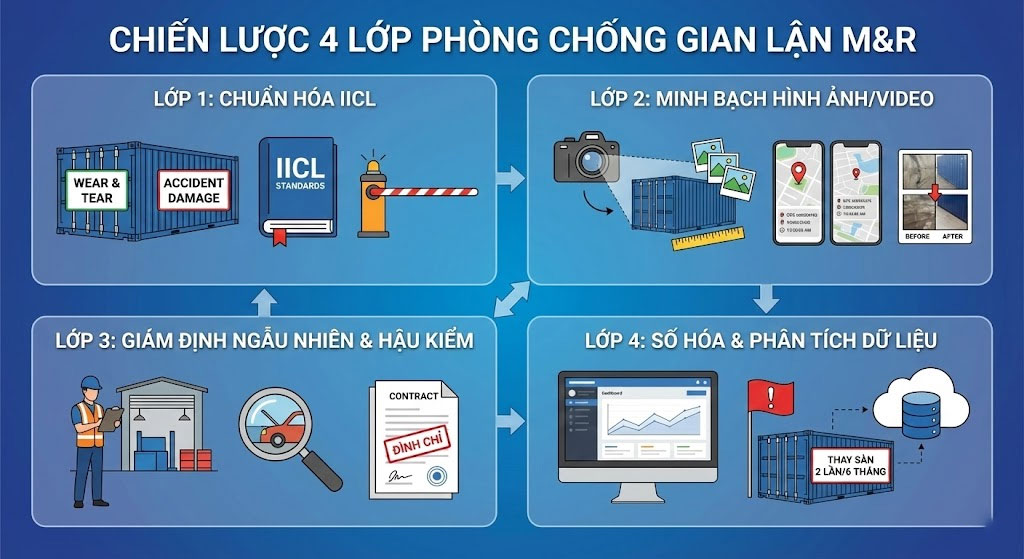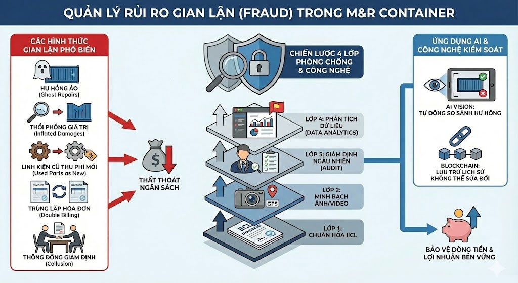 Trong quản trị tài sản container, chi phí Bảo trì và Sửa chữa (M&R) là khu vực dễ xảy ra gian lận nhất do tính chất đặc thù: hàng ngàn thiết bị luân chuyển liên tục, hàng trăm hạng mục sửa chữa nhỏ lẻ và sự bất đối xứng thông tin giữa xưởng sửa chữa và chủ sở hữu. Nếu không có cơ chế kiểm soát chặt chẽ, doanh nghiệp có thể thất thoát từ 10-15% ngân sách M&R hàng năm cho các yêu cầu sửa chữa “ảo” hoặc bị thổi phồng giá trị.