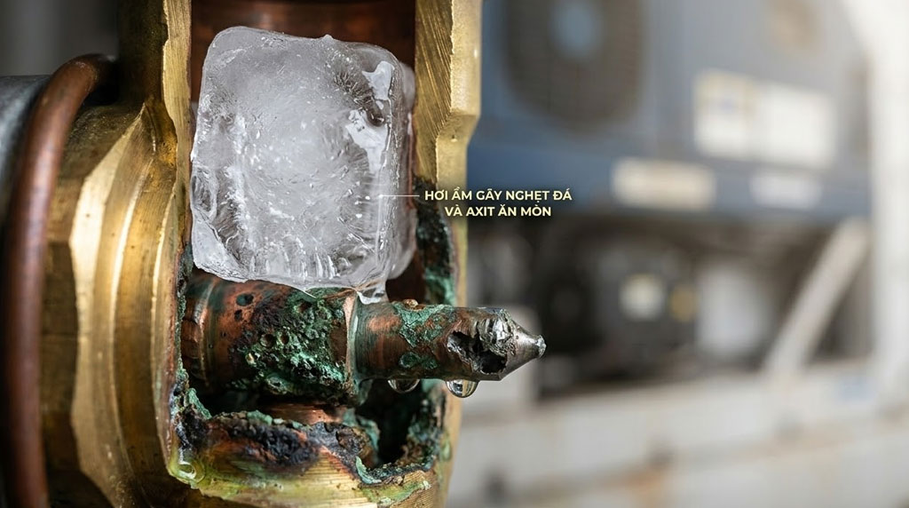 - Gây nghẹt tiết lưu (nghẹt đá): Khi máy hoạt động, nhiệt độ tại van tiết lưu xuống rất thấp. Hơi ẩm trong gas sẽ đóng băng ngay lập tức tại đây, gây tắc nghẽn dòng chảy của môi chất lạnh. Máy sẽ báo lỗi và ngừng làm lạnh ngay lập tức.
