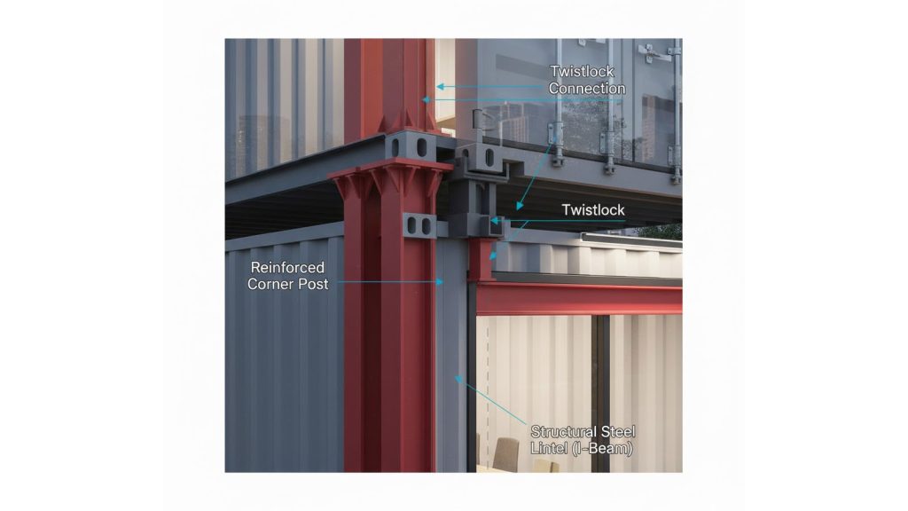 Mặc dù container được thiết kế để chồng tầng khi làm kho chứa hàng, nhưng khi chuyển đổi sang công năng văn phòng (có cắt vách làm cửa sổ, cửa đi), cấu trúc nguyên bản đã bị thay đổi đáng kể. Do đó, việc gia cố là bắt buộc: