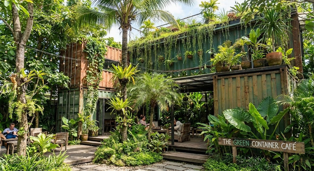 5. Mẫu cafe container phong cách Sân vườn (Tropical Greenery)