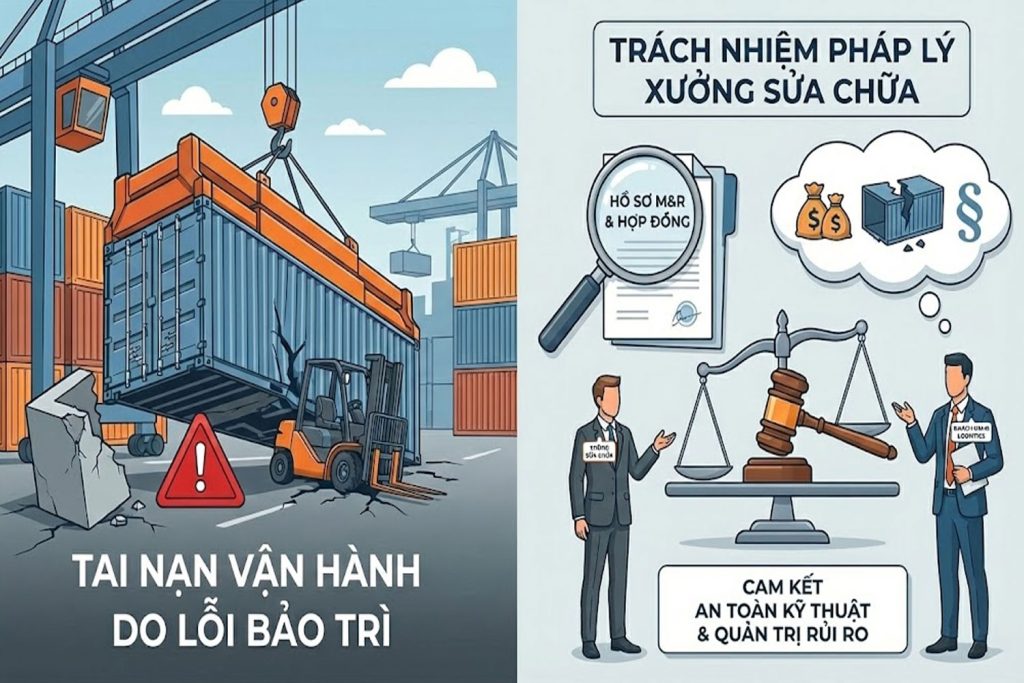 Trong chuỗi cung ứng logistics, an toàn kỹ thuật của container là yếu tố tiên quyết. Khi một tai nạn vận hành xảy ra (ví dụ: container bị sập sàn, gãy khung khi đang nâng hạ, hoặc rò rỉ hóa chất do van khóa hỏng), việc xác định trách nhiệm pháp lý thường tập trung vào đơn vị thực hiện bảo trì và sửa chữa (M&R). Một lỗi nhỏ trong quá trình hàn xì hoặc kiểm tra kỹ thuật không kỹ lưỡng có thể dẫn đến những hậu quả pháp lý và tài chính khổng lồ.