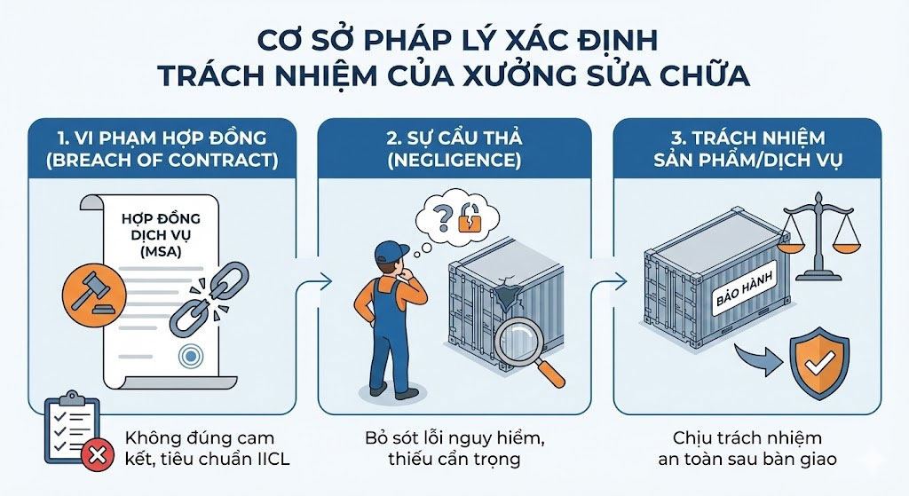 - Vi phạm hợp đồng (Breach of Contract): Nếu xưởng không thực hiện đúng các hạng mục sửa chữa đã cam kết trong báo giá hoặc không tuân thủ tiêu chuẩn kỹ thuật (như IICL) ghi trong hợp đồng dịch vụ khung (MSA).